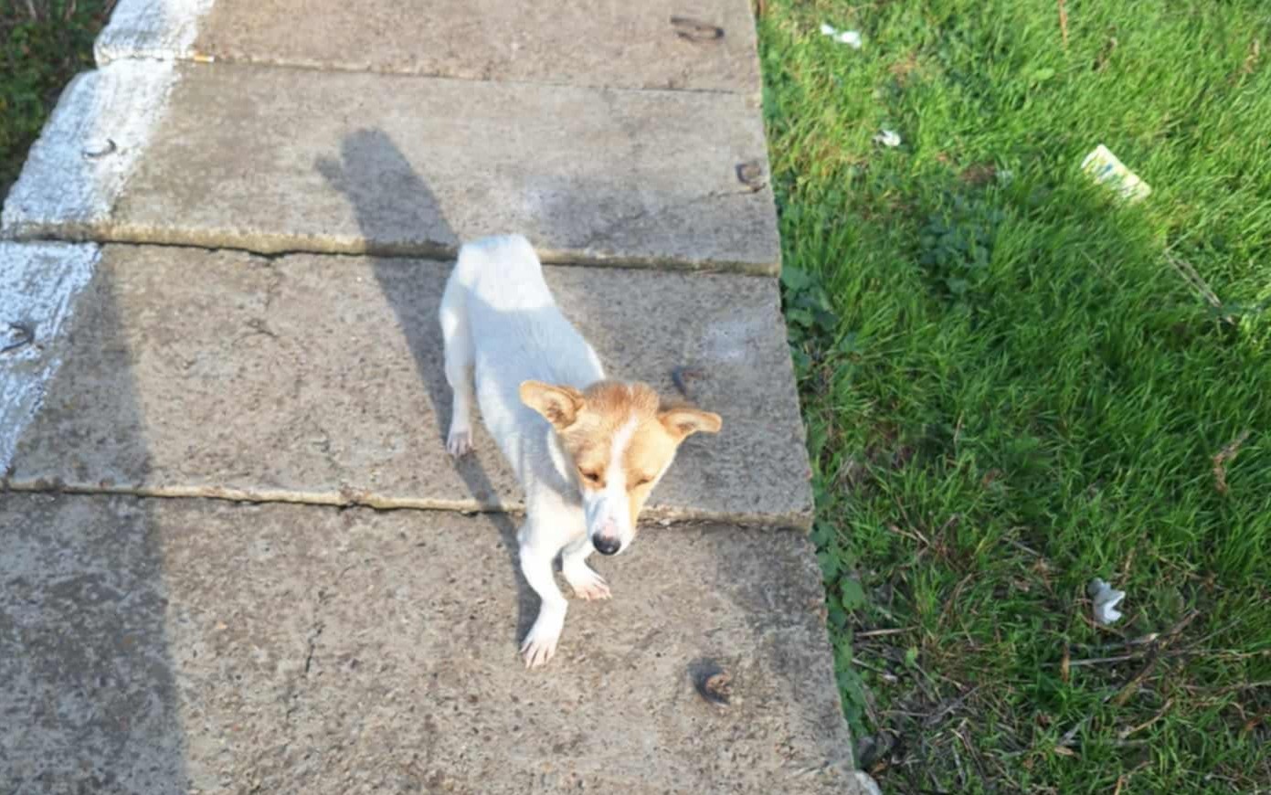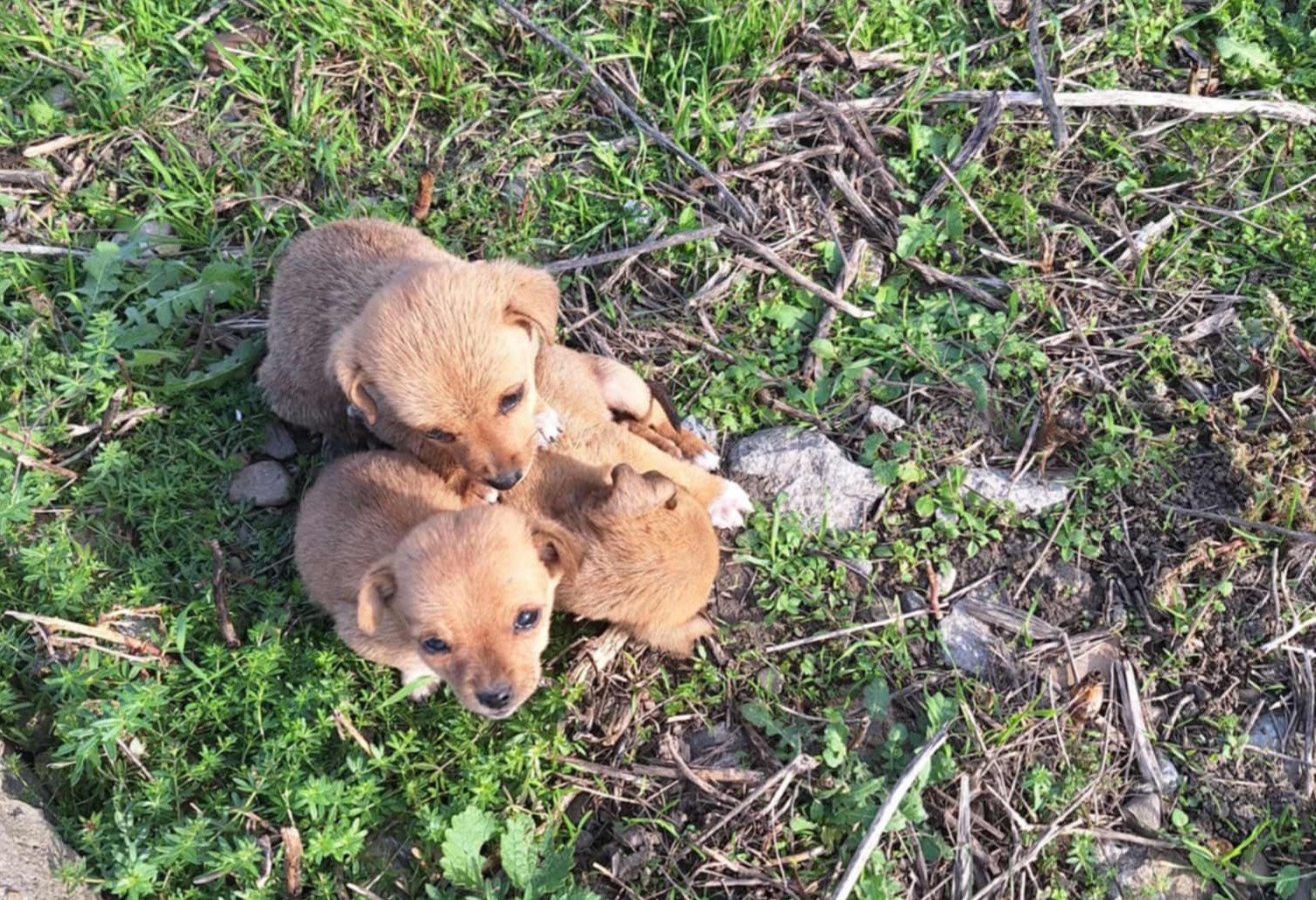 O cățelușă cu trei pui au fost lăsați să moară pe un câmp din județul Botoșani. Cățelușa era slabă, înfometată, cu urme adânci de lanț la gât, dar chiar așa tot încerca să își apere puiuții care se îngrămădeau unul în celălalt de frig. Așa au fost găsiți pe un câmp din Dimăcheni, lângă linia de tren.