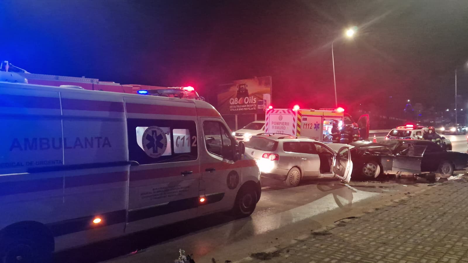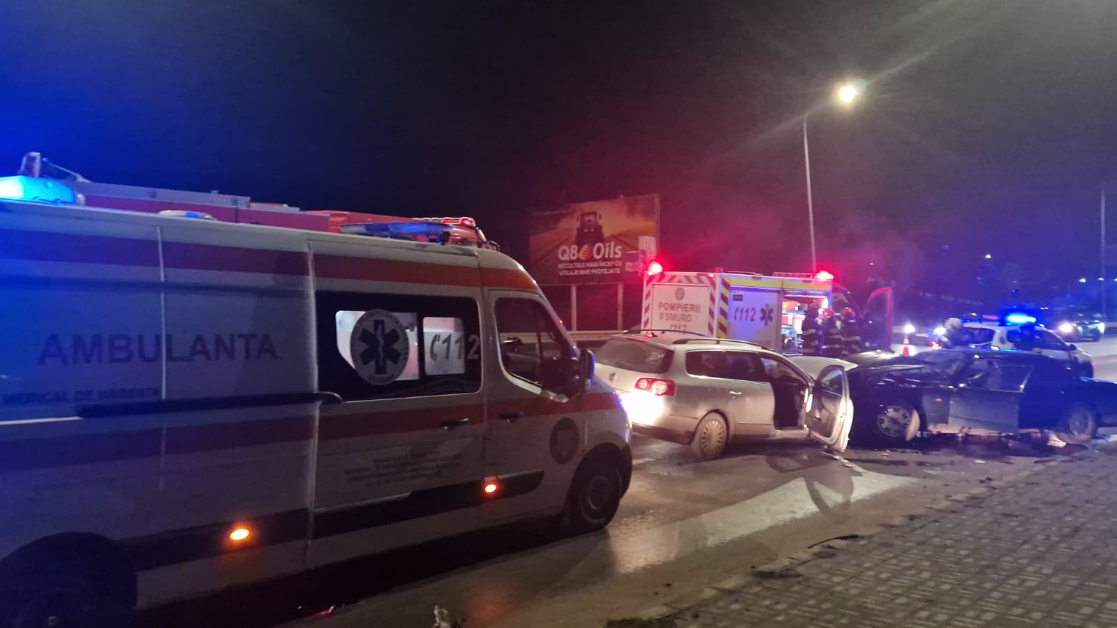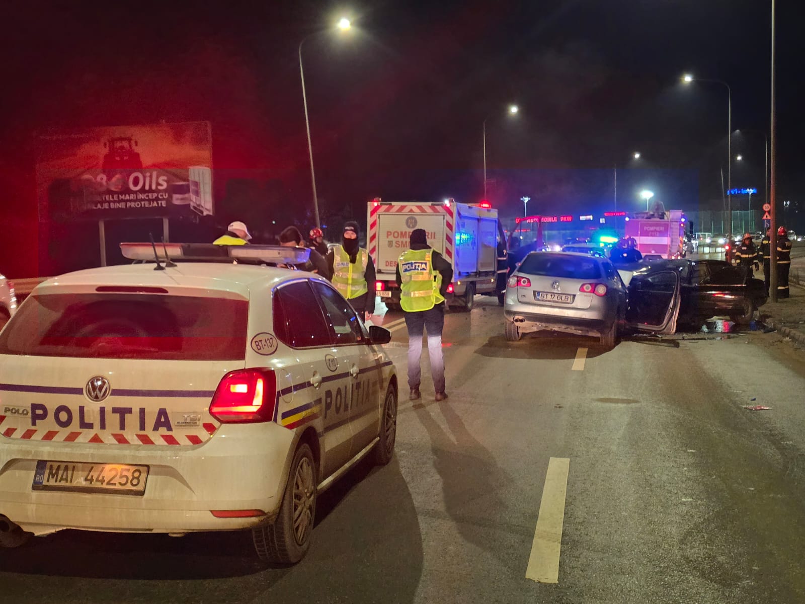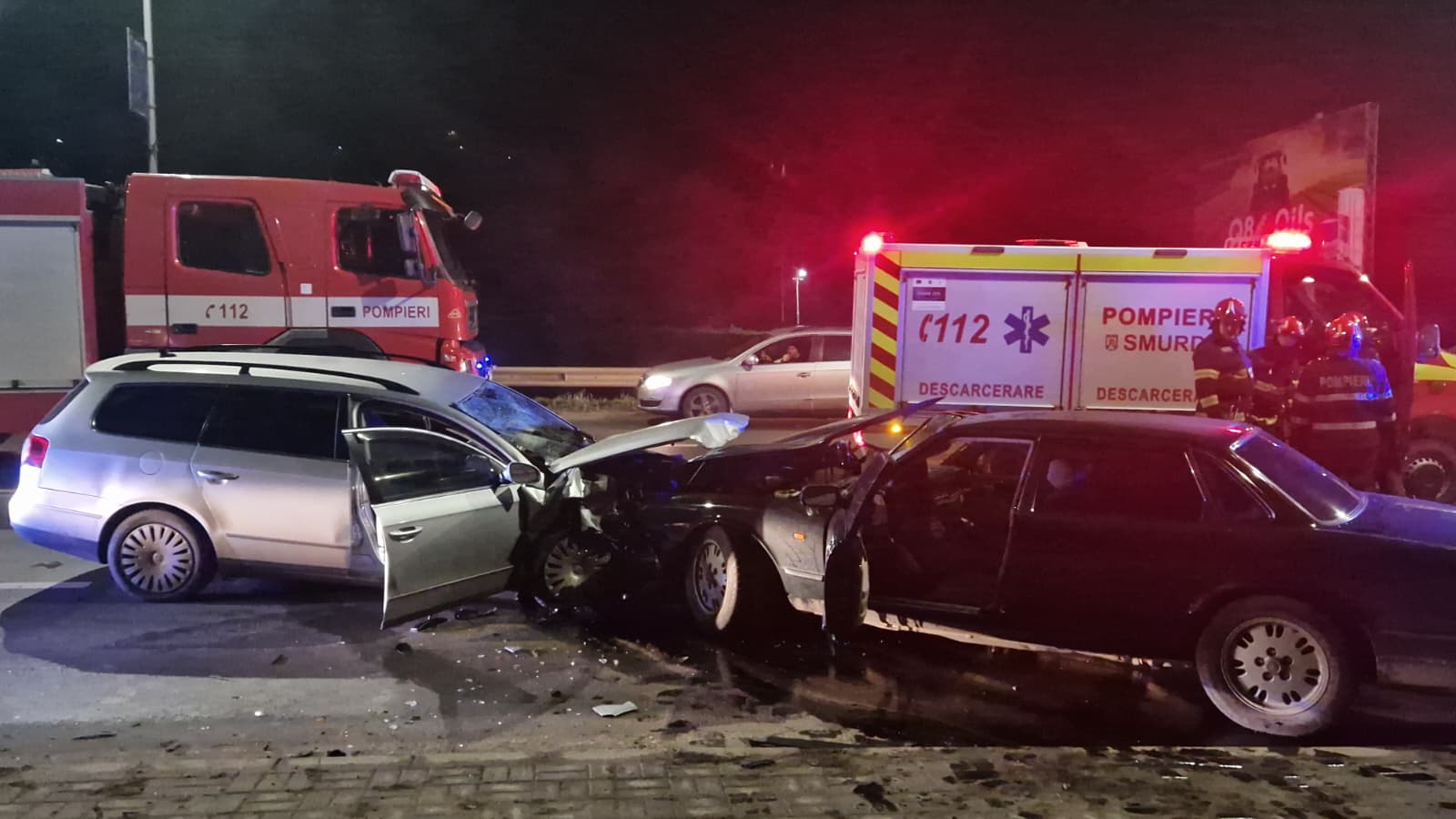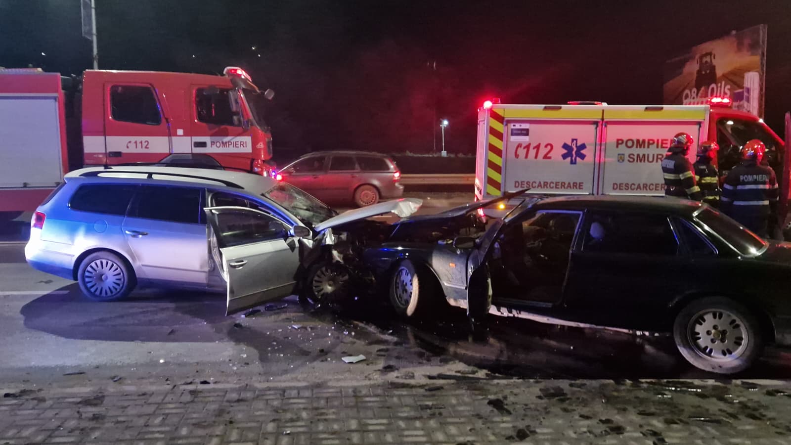 Două mașini s-au ciocnit violent, iar din accident au rezultat patru victime. Impactul s-a produs între un Volkswagen și un Jaguar după ce șoferul Jaguarului a intrat cu mașina pe contrasens. VW cobora spre Dedeman, iar Jaguarul venea dinspre Hudum.
