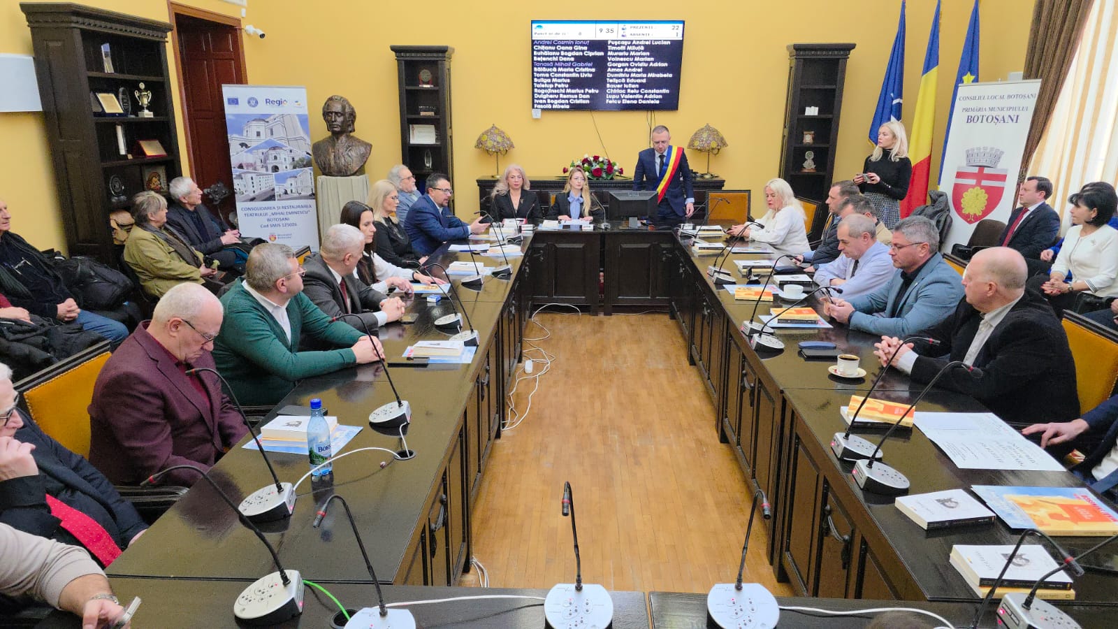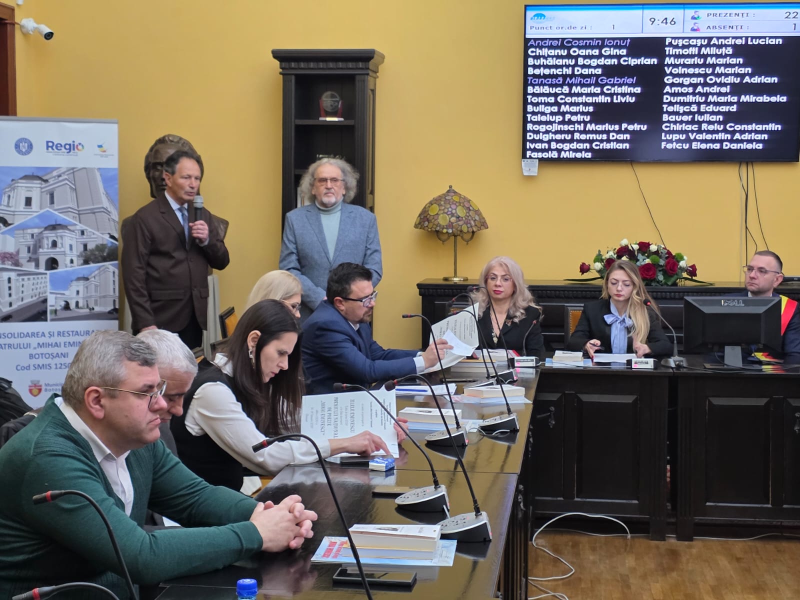 Consilierii locali s-au întrunit joi dimineață în cadrul unei ședințe festive, unde au votat pentru acordarea titlului de Cetățean de Onoare al municipiului Botoșani poetului laureat al Premiului Național de Poezie Mihai Eminescu- Opera Omnia.